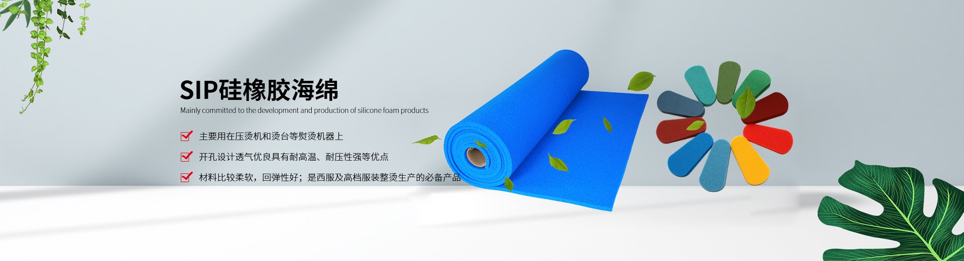 ????我公司生產(chǎn)的硅膠海綿具有耐高溫、耐壓、透氣性能好、抗撕拉、使用壽命長、環(huán)保等特點,主要適用于服裝干洗、水洗熨燙設備,如壓燙機和燙臺等。另外我們也提供各種燙氈、罩布等整燙專用墊料,客戶可根據(jù)不同熨燙工藝選擇不同的搭配組合,滿足高品質(zhì)的熨燙要求。